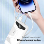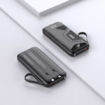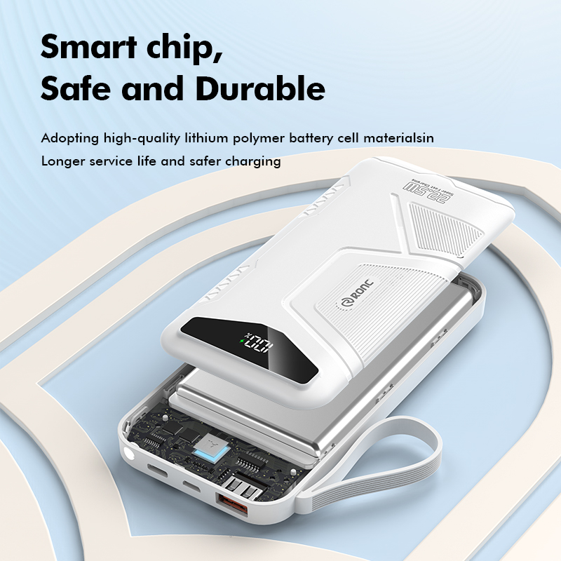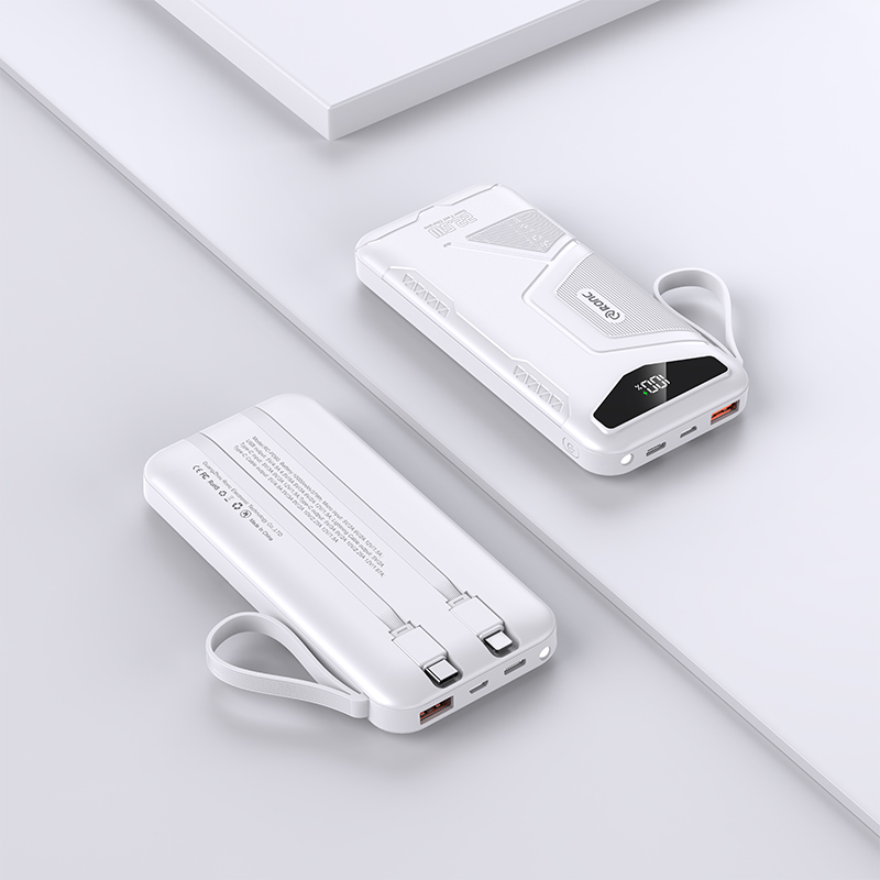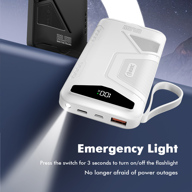This versatile power bank is available in 10,000mAh, 20,000mAh, and 30,000mAh capacities, It features a sleek design in Black or White, with a durable ABS + PC casing for enhanced durability. Powered by high-capacity 1260110 battery cells, It supports 22.5W Super Fast Charging input and PD 20W bidirectional fast charging output. It comes with two built-in cables for added convenience and an LED light. Compact in size, It measures 144*68*18.8/30.8mm, or 147*68*42.8mm depending on capacity.