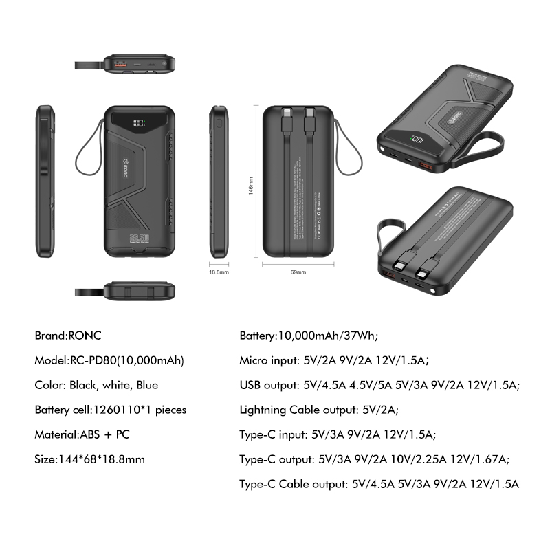 Be the first to review “10,000/20,000/30,000mAh Exclusive Patent Power Bank with 22.5W/PD20W Super Fast Charging and Built-in 2 Cables,Customized Power Bank, RC-PD80” Cancel reply