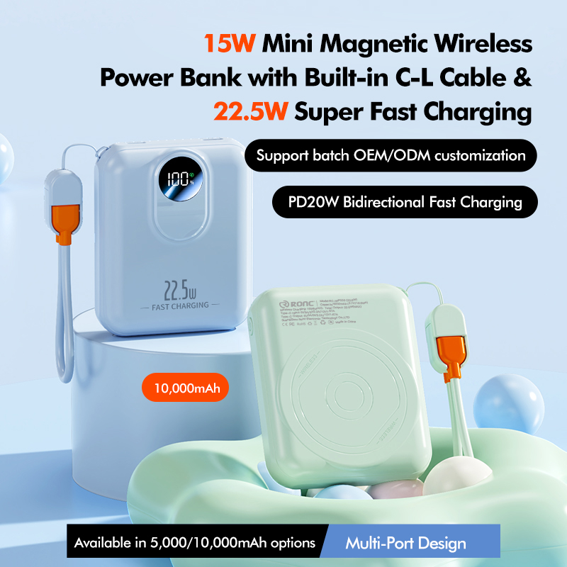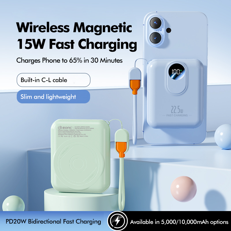 15W Mini Magnetic Wireless Power Bank with Built-in C to L Cable,22.5W Super Fast Charging & PD 20W Two-Way Fast Charging,Available in 5,000mAh / 10,000mAh RC-WP035